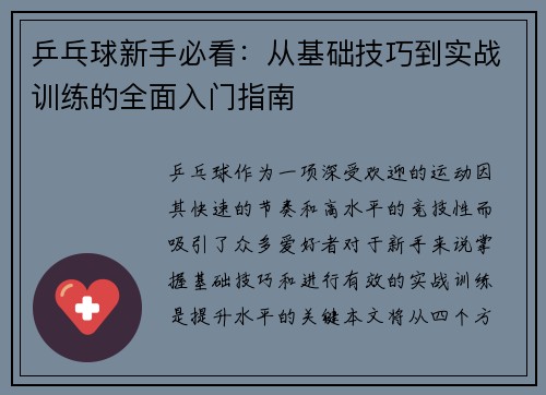 乒乓球新手必看:从基础技巧到实战训练的全面入门指南